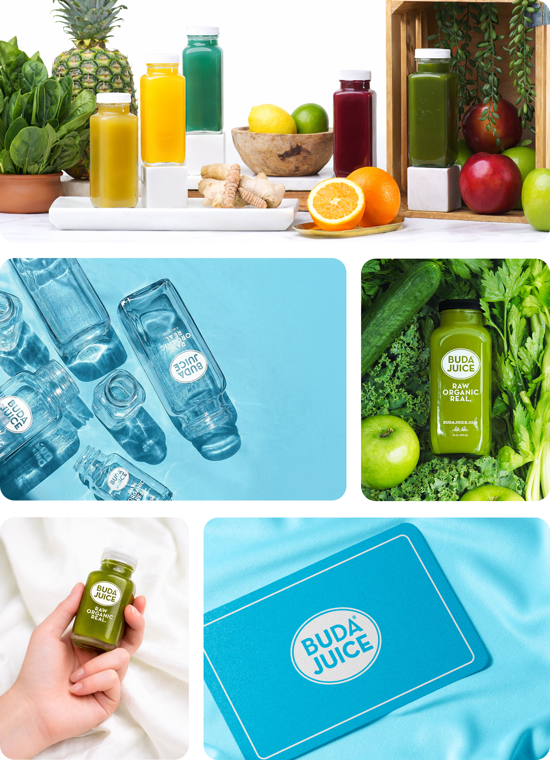 Buda Juice’s commitment to glass packaging, local sourcing, and low-impact production became a core visual motif to the brand.