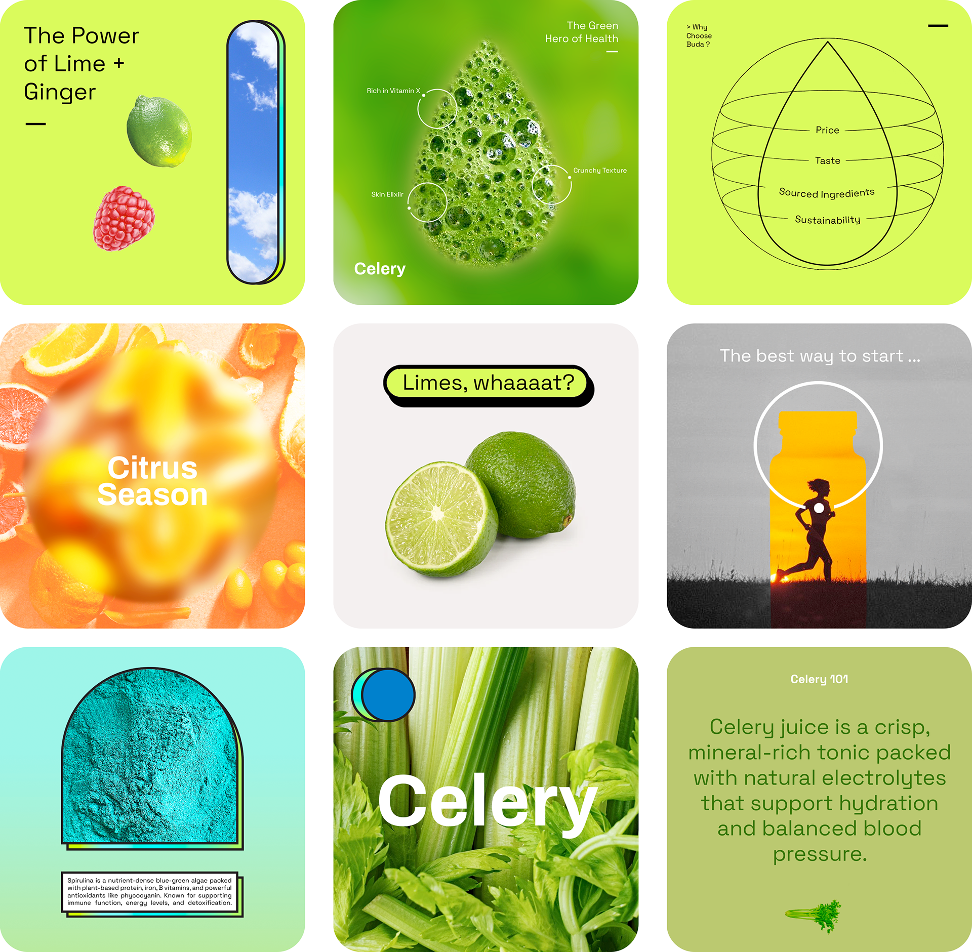 My role was to translate that integrity into a cohesive visual and content system one that elevates juice from commodity to considered lifestyle. I led the general art direction, tone, visual language, and core photography for Buda. Established a cohesive system that balanced elevated, ingredient-led storytelling with a fresh, contemporary sensibility.
