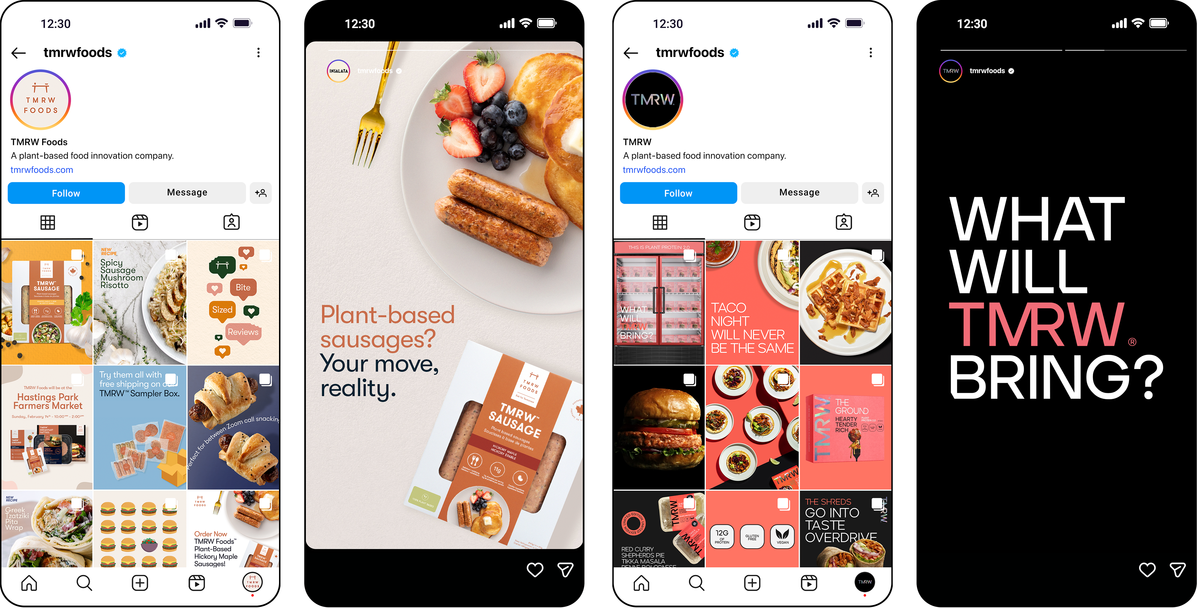 Across both eras of the TMRW brand, the advertising content had to do double duty: perform in-feed while staying true to the identity it represented. The earlier system leaned into being approachable and easy to order. The rebranded system flipped the approach entirely: black backgrounds, oversized type, and hero food shots confident enough to command attention with much less copy.